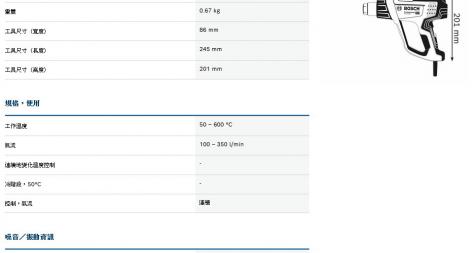 嚴苛應用、全方位掌控 全方位溫度控制 : 無極變速氣流、可微調溫度( 每次 10 °C ) 及可根據溫度需求和空氣流量,設置 4 種設定 1300W 動力輕鬆平穩達到 600 °C (因台灣販售機台為低電壓機種,因此實際入力及溫度會與上方原始規格有些許差異) 當馬達過熱時,熱保護關閉機制自動開啓