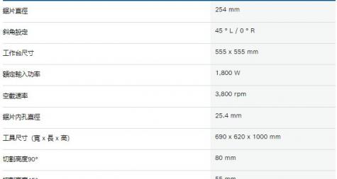 提供強大的切割能力圓鋸台 需要進行強大而精確的切割作業時的理想選擇 545 mm的縱切能力;切割深度為直線:80 mm , 45度角:55 mm 1800 W馬達,具有高扭力和理想的負載能力 (台灣販售的版本為入力1600W) 輕鬆又精確:堅固的工作台可確保工作時的穩定性 附有滑輪的265 mm延伸工作台,切割範圍更大 配備堅固耐用的金屬支架,可確保穩定性