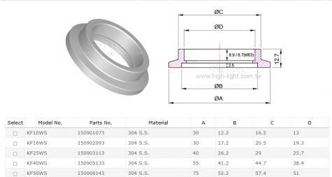真空KF法蘭適用於通過真空製程配管與高真空腔體接續。也適用於焊接在真空幫浦管線配管中的不銹鋼管或不銹鋼軟管。