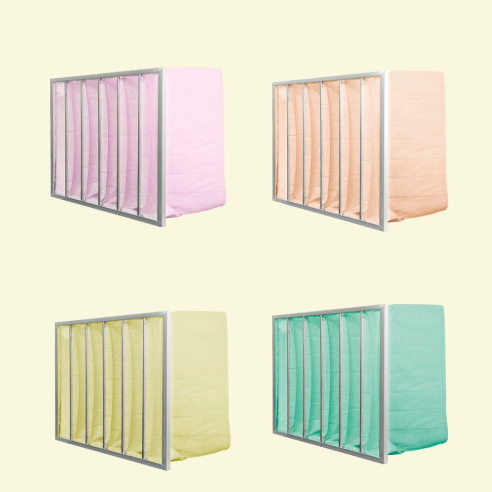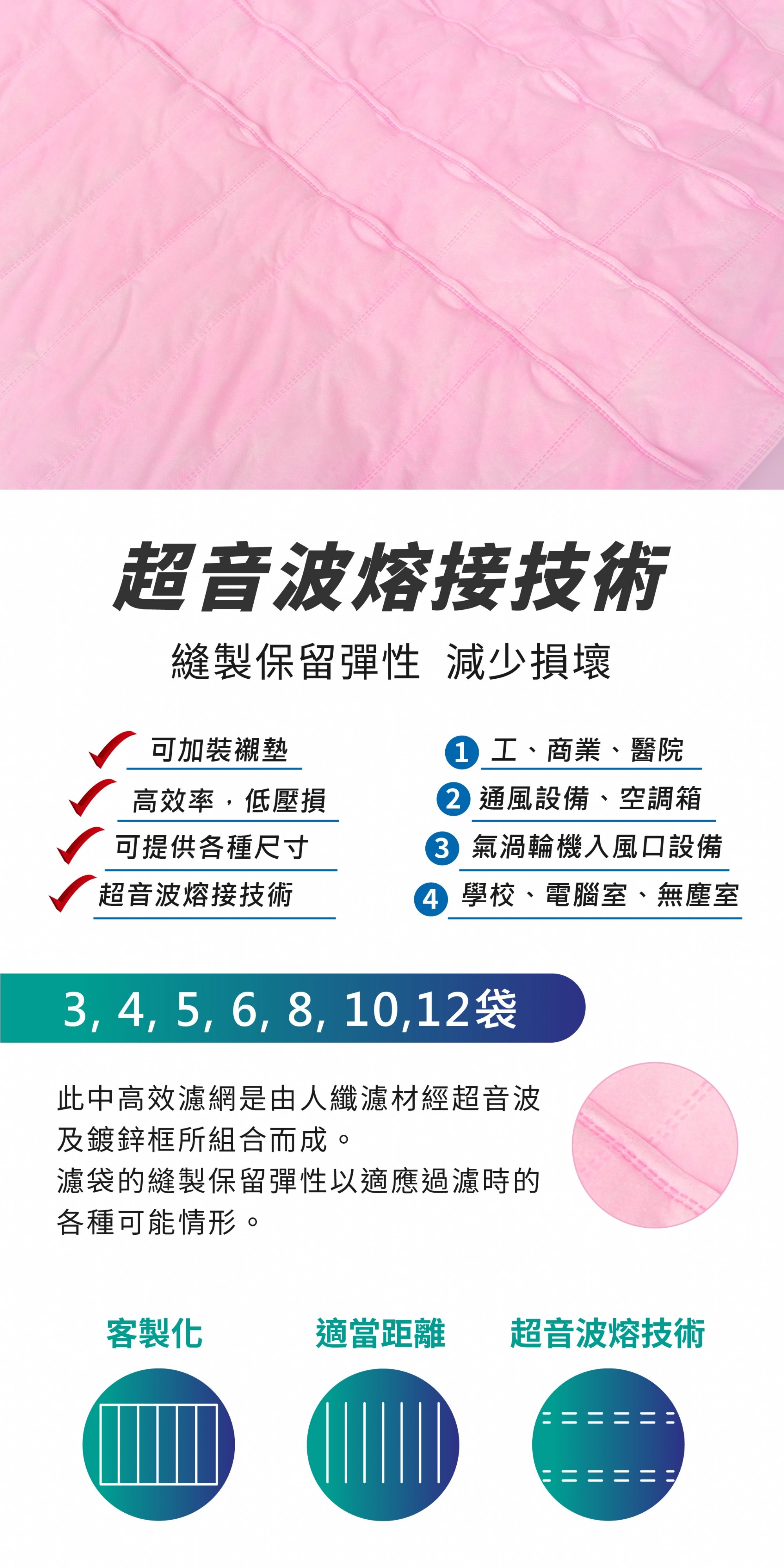 中效人纖袋型濾網 ASHRAE Ultra Sonic Synthetic Pocket Filters 此中高效濾網是由人纖濾材經超音波及鍍鋅框所組合而成。 濾袋的縫製保留彈性以適應過濾時的各種可能情形。 此袋形濾網能維持良好的過濾效果同時保持低壓損。