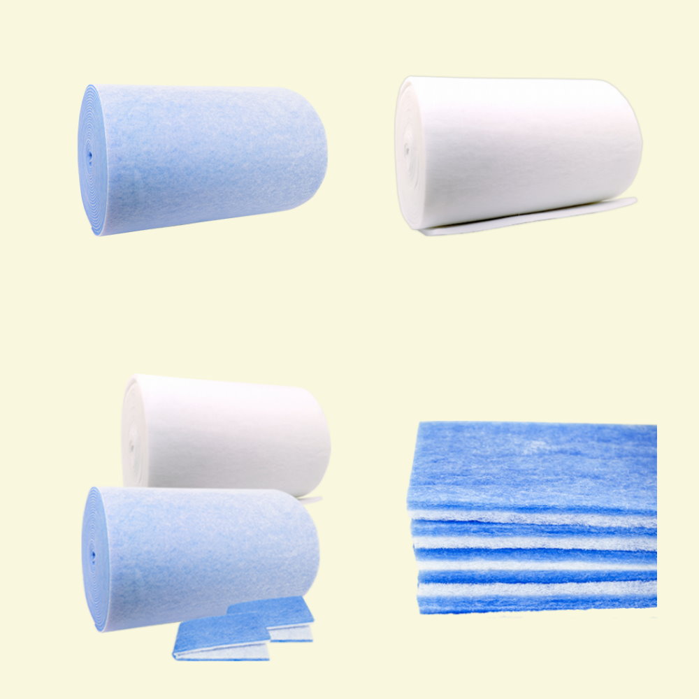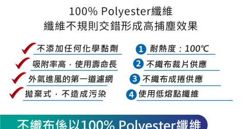 多元酯不織布係以100% Polyester纖維,經溫度加熱結合纖維成不規則交錯狀,形成高捕塵效果。