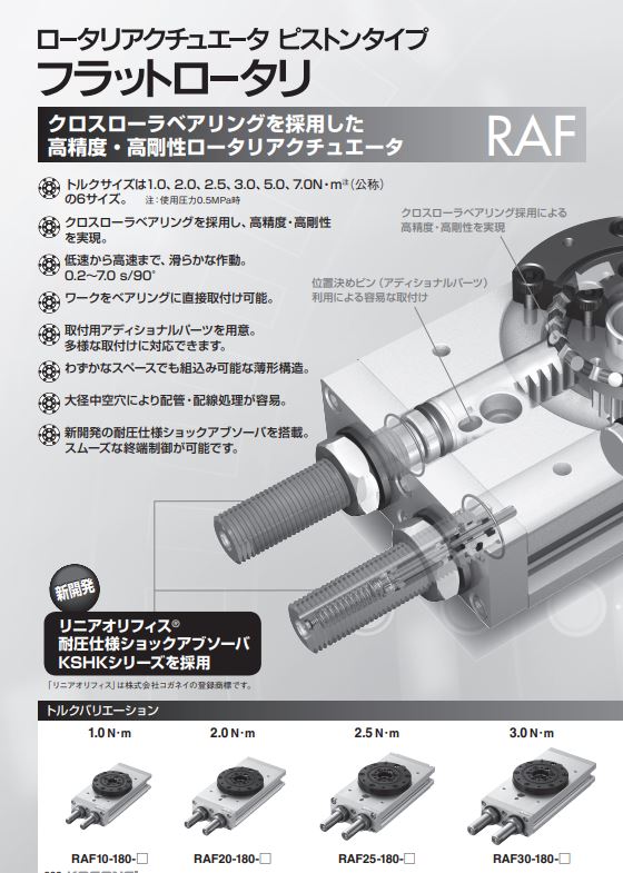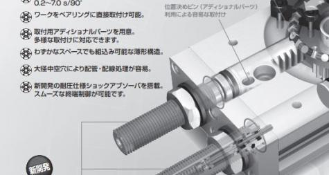 ● 缸徑Φ10-70 配置交叉滾子軸承,實現高精度、高剛性、低重心、薄型化。使用新開發的耐壓減震器平滑終止控制。