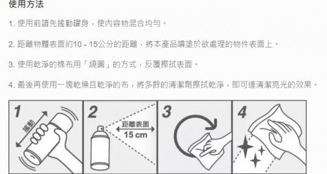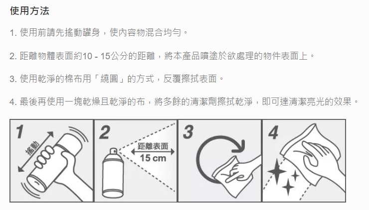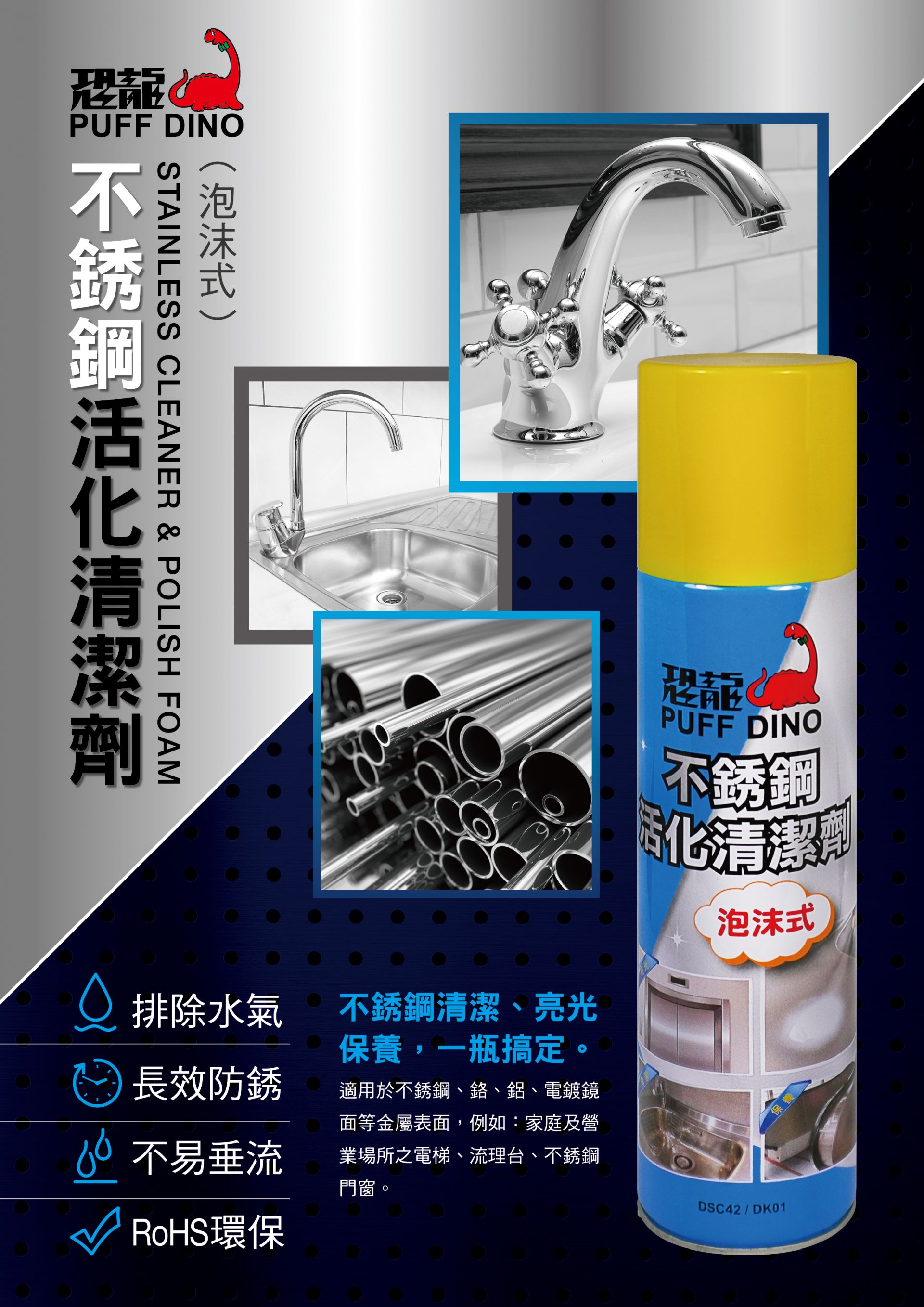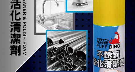 本產品為「泡沫式」清潔劑,適用於多種金屬表面,對於油污、指痕、髒污、頑垢具有良好的清潔亮光效果。