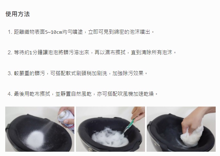強效清潔:乾洗泡沫有效去除織布孔隙中汗漬、油汙、塵垢。
