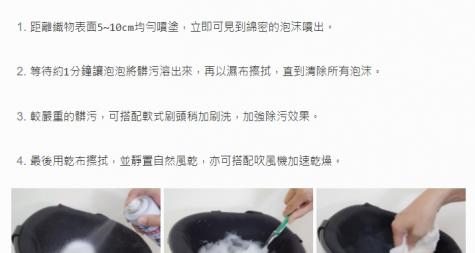 等待約1分鐘讓泡泡將髒污溶出來,再以濕布擦拭,直到清除所有泡沫。