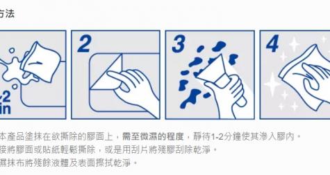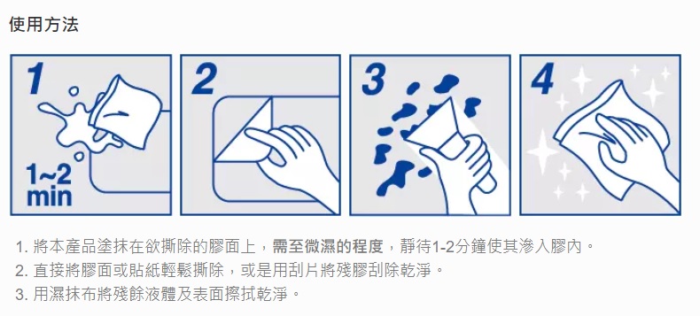 塗抹後可輕易去除各種膠類及髒汙,即便是陳年的殘膠都能有效撕除,具有非常良好的清潔效果。