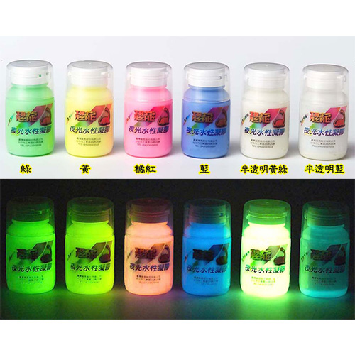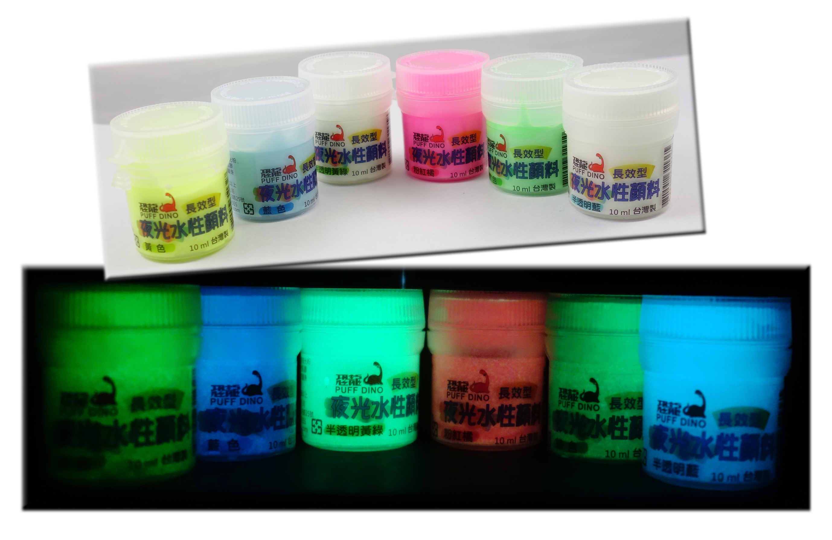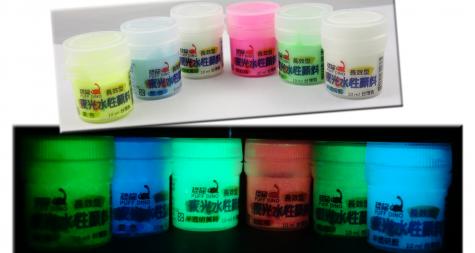 同時具有夜光及螢光的效果,光害的容忍度比一般夜光漆高。在紫光燈下非常亮。
