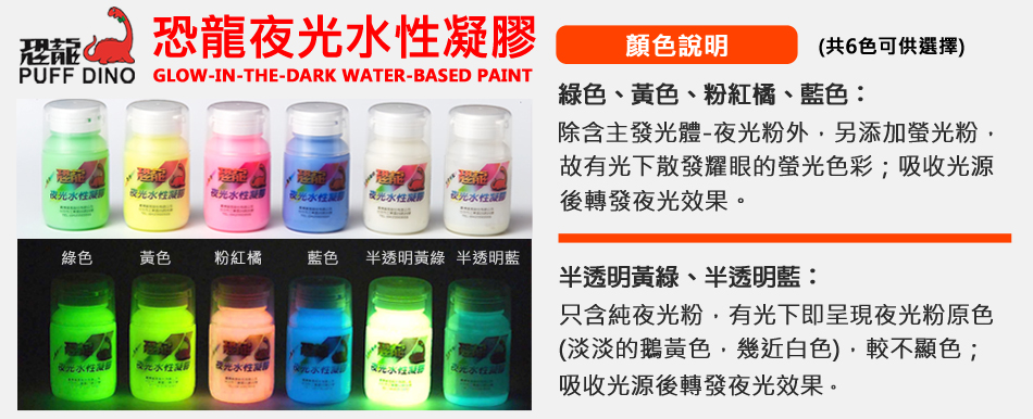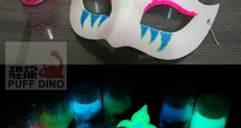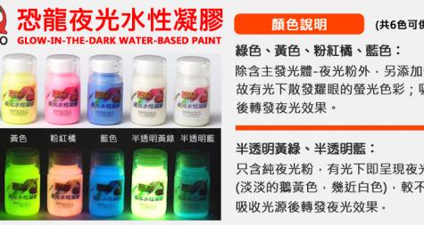 同時具有夜光及螢光的效果,光害的容忍度比一般夜光漆高。在紫光燈下非常亮。