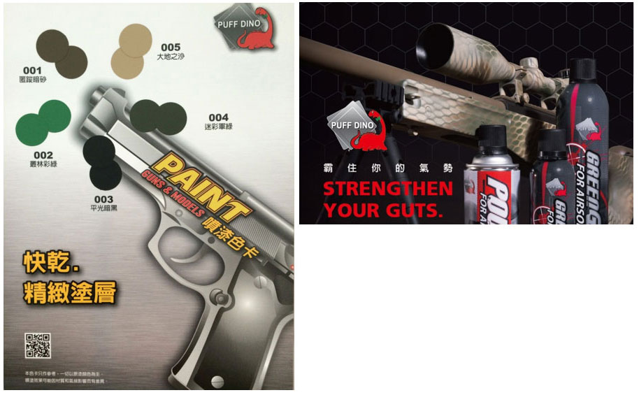 專為各式槍械及模型使用而設計,可噴出迷彩樣式。使用精密研磨的漆料讓塗層極薄,具有優異的附著力以及遮蓋率。讓使用者輕鬆完成專業的槍枝及模型上色作業。