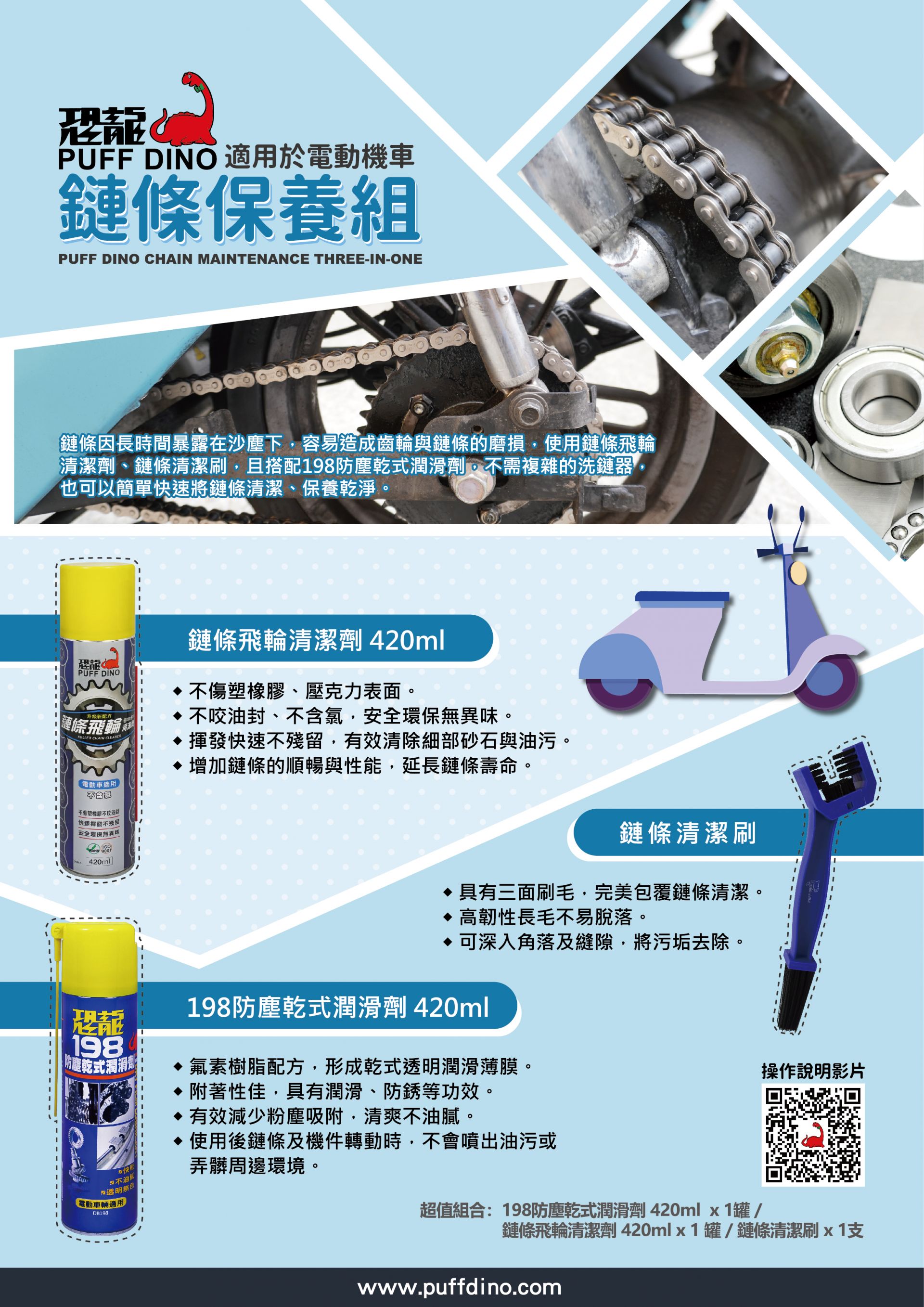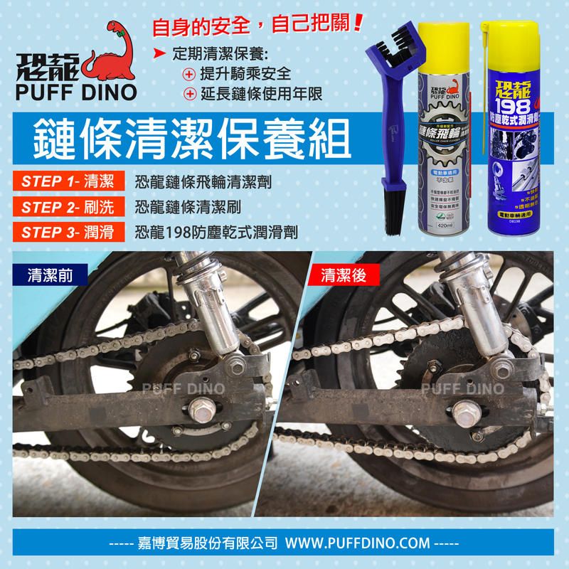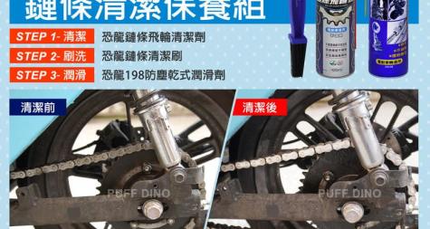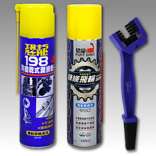 恐龍鏈條飛輪清潔劑*1、恐龍鏈條清潔刷*1、恐龍198乾式潤滑劑*1