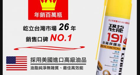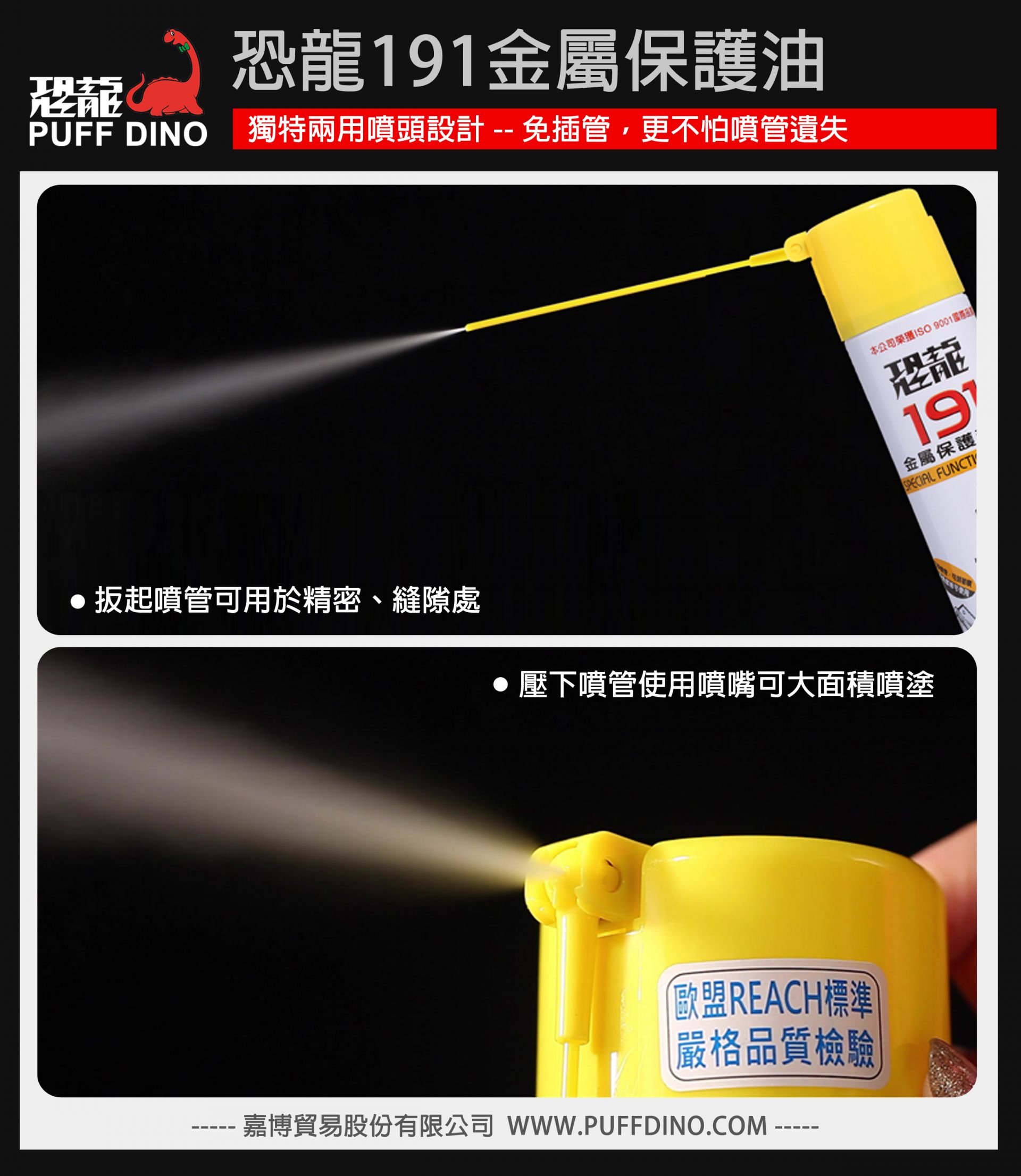 恐龍191適用於各種金屬工具、零配件、設備裝置之維護保養,可清除物品的油脂髒污同時提供防銹潤滑的效果,並且能隔絕濕氣。