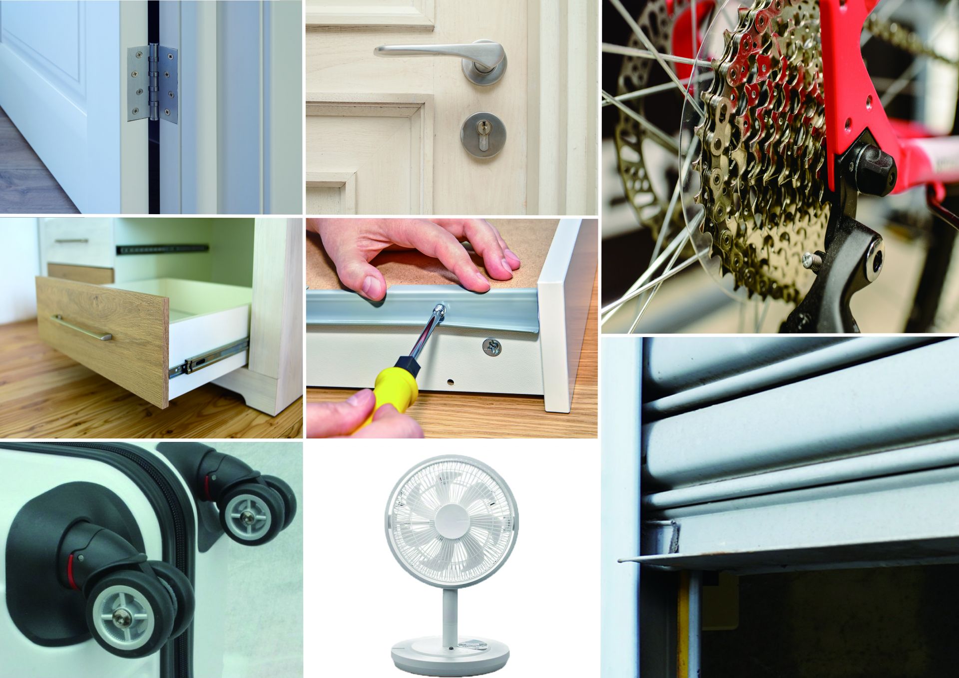 門窗轉軸有雜音、 門鎖卡卡、腳踏車鏈條不順、螺絲很難拔除、梅雨季時工具要防銹、行李箱很難拉、電扇運轉有異音、鐵捲門軌道有異音、鍵盤架軌道卡卡…等。(使用在電器上需先關閉電源)