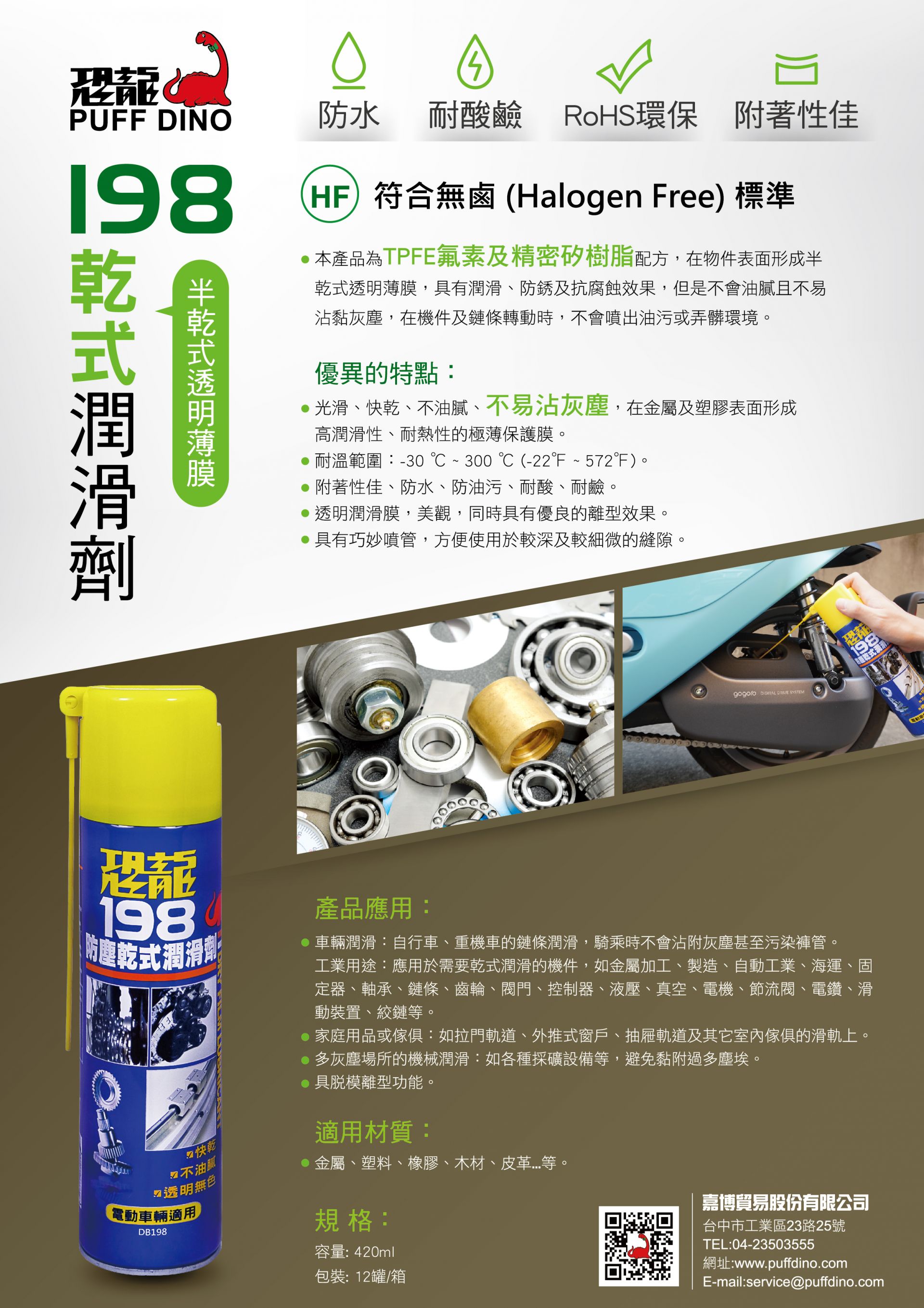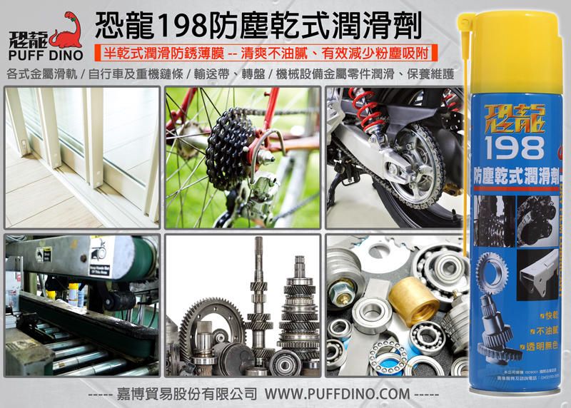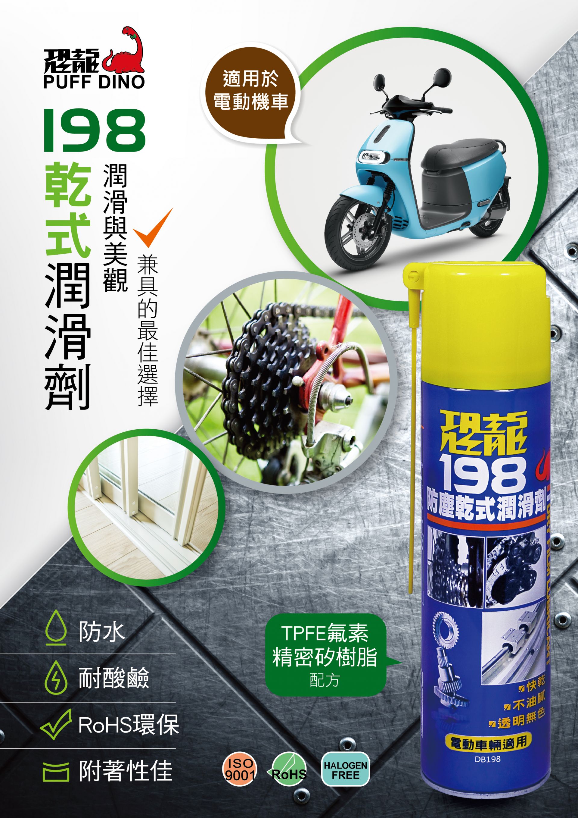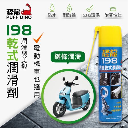 電動車鏈條載運行轉動時,若沾黏塵土或砂石,將造成鏈條磨損,減少壽命,修繕費用不斐,因此這款恐龍198乾式潤滑劑成為兼具潤滑、保養與美觀的首選產品。