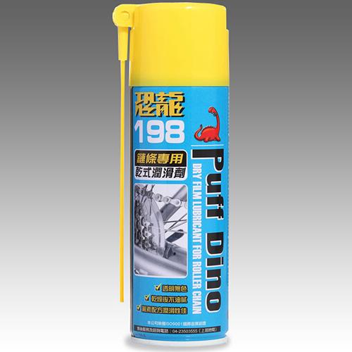 恐龍198鍊條專用乾式潤滑劑為半乾式潤滑產品,含氟素及矽樹脂配方,潤滑防銹效果很好,用在自行車與重機的鏈條上,具滲透效果並形成半乾式透明潤滑膜,不會油膩且不易沾黏塵土。
