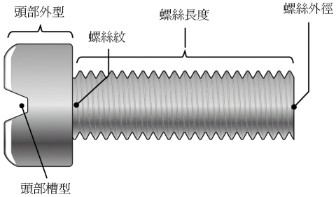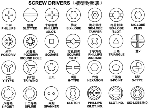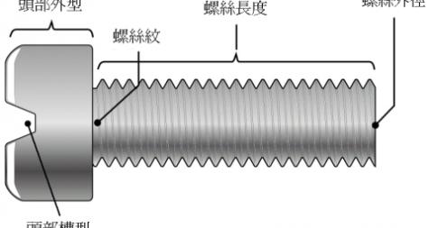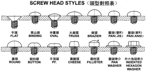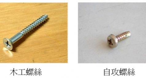 二. 常用螺絲種類: A: Machine Screw: 機械螺絲 B: Tapping Screw: 自攻螺絲 (分使用於金屬與使用於塑膠二種) B-1: Sheet Metal Tapping Screw. (鐵板牙自攻螺絲) B-2: Plastic Tapping Screw. ( 塑膠用, 自攻螺絲) C: Wooden Screw : 木工螺絲 D: Drywall Screw : 水泥墻螺絲