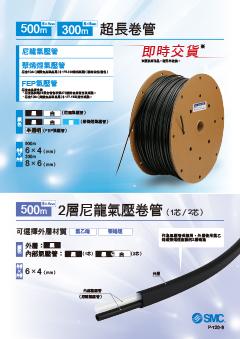 ● 超長卷管:尼龍氣壓管/聚烯烴氣壓管/FEP氣壓管 .外徑X內徑:500m/6 × 4 (mm); 300m/8 × 6 (mm) ● 2層尼龍氣壓卷管 (1芯/2芯) .外徑X內徑:500m/6 × 4 (mm)