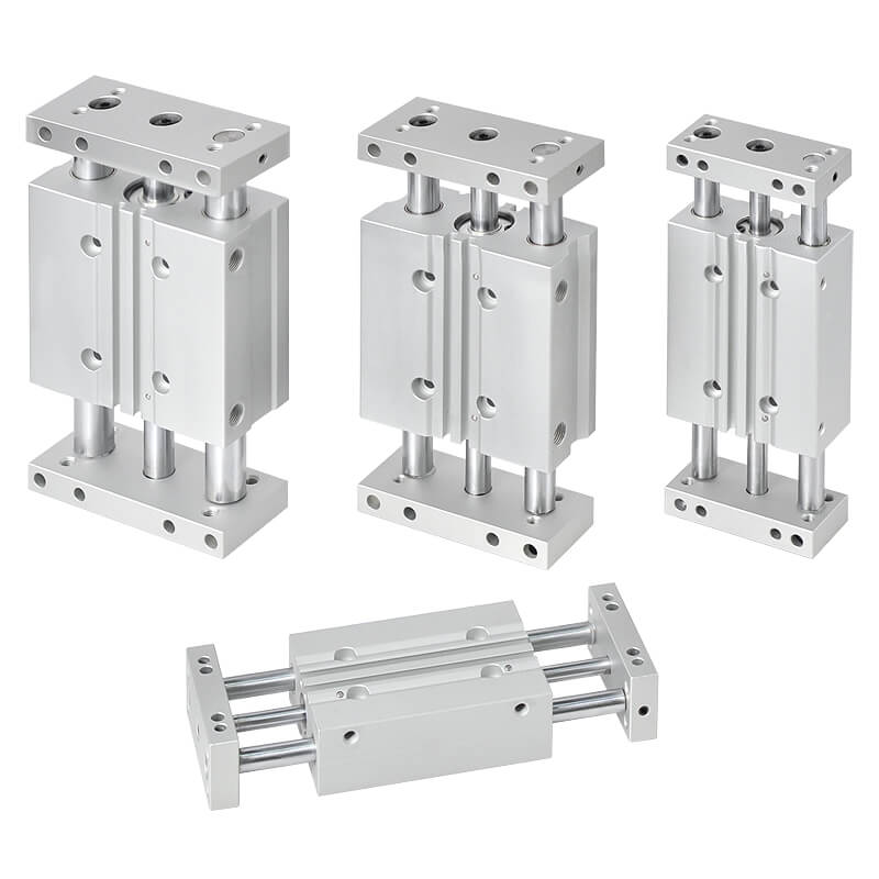 MCGD 氣缸內徑: φ 12, 16, 20, 25, 32 (mm),客戶設計使用時,可作「連接塊固定」或「本體固定」兩種方式安裝。配置四個埋入式溝槽,方便安裝傳感器。 依使用時的精度需求,在導桿軸承部設計有「平滑動軸承」、「線性滾珠軸承」兩種。