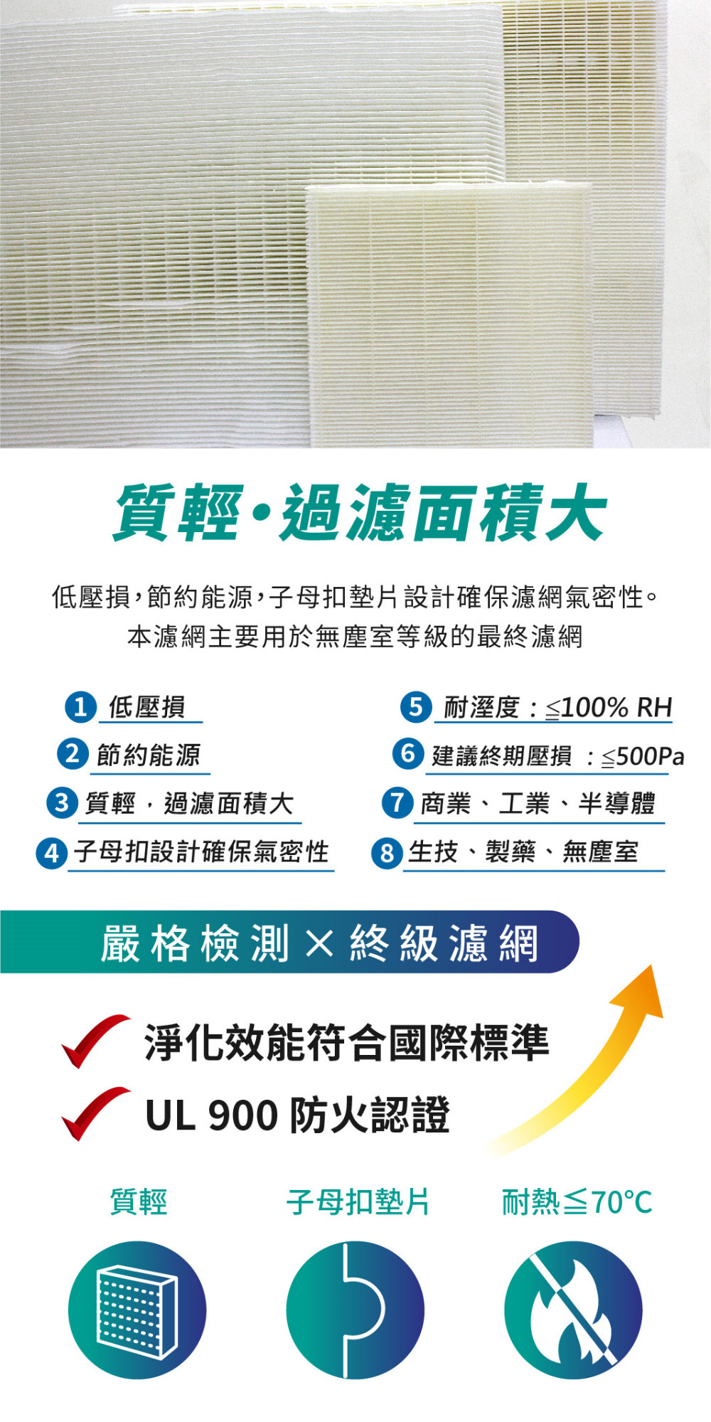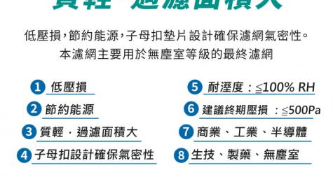 細折景高效〈HEPA〉濾網 Mini-pleat HEPA Filter 此濾網可使用於濕度高的環境並提供層流控制,低初期壓損可延長使用壽命且UL900認證 可符合嚴格的防火等級。 亦可提供耐高溫之高效過濾網;此濾網可去除各種空氣中的污染物並作為終期濾網。