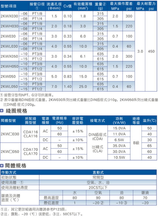 1、直動常開型二口二位電磁閥,換向迅速、靈敏; 2、使用壓力範圍廣,有超高壓型(X)、高壓型(H)、標準型、大流量型(L)可供選擇; 3、結構緊湊、體積小,重輕,裝拆方便; 、閥體材質黃銅,電磁線圈耐熱等級為B級,標準密封件材質為FPF(氟橡膠), 適用於多種工作介質,其它材質密封件可定制,請諮詢本公司技術部門; 5、線圈防護等級IP65,接電方式有直接出線式、DIN插座式。