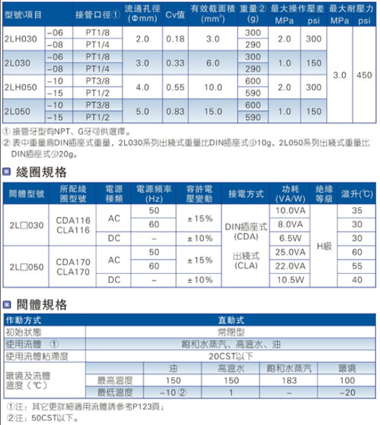 1、直動常開型二口二位電磁閱,换向迅速、震敏; 2、使用壓力範圍廣,高壓型(H)、標準型可供選擇; 3、结構緊湊、體積小,重量輕,装拆方便 4、閣體材質SUS304不銹鋼,電磁線圈耐熱等级為H級,密封件材質為PTFE(鐵氟龍),適用於多種工作介質,特別適用于高溫水及飽和水蒸氣 5、線圈防護等級IP65,接電方式有直接出線式、DIN插座式。