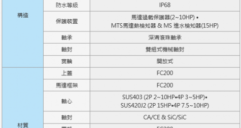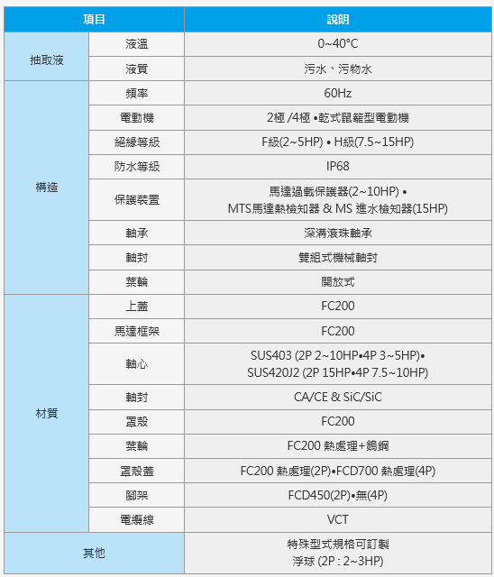● 配備齊全:環氧樹脂(Epoxy)防水電纜基座、馬達過載保護器、雙組式SiC矽碳鋼(Silicon Carbide)機械軸封,皆符合ISO 9001品質保證系統並通過嚴謹的檢驗程序。