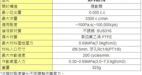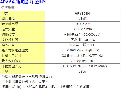 提動閥屬於空壓作動式閥。使用0.30MPa以上的空氣壓就可開啟閥,並透過內藏的彈簧來關閉閥。 利用膠材的壓送壓力與閥的開放時間並搭配不同的針頭口徑尺寸,實現定量吐出控制。 此閥於關閉時,具可微調式"回吸"定量材料之功能,使重複吐出量更精準。