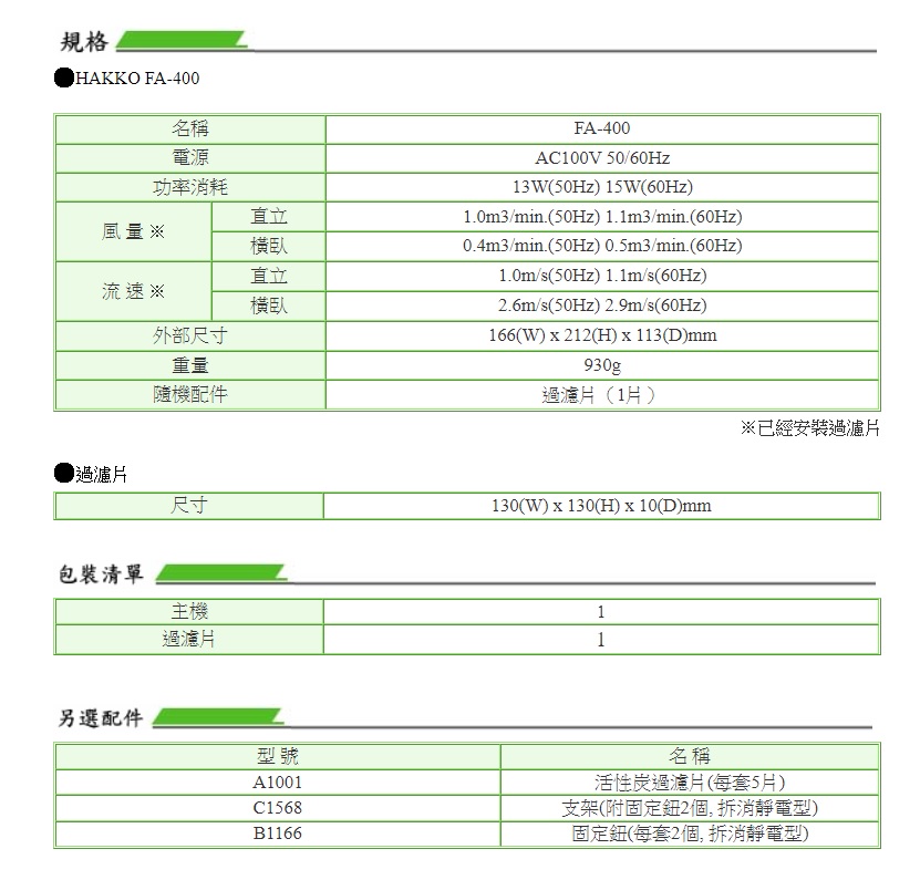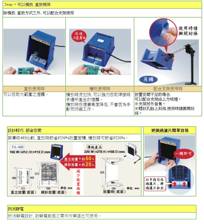 FA-400吸煙儀可以有效吸除焊接時所產生的有毒煙霧, 保障工作人員的身體健康, 是安全舒適的工作環境不可或缺的工具。