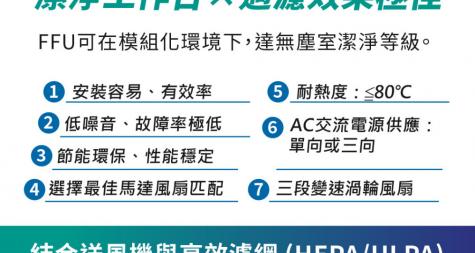 風機過濾網機組 Fan Filter Unit 風機濾網機組(Fan-Filter Unit, FFU)是一種結合送風機與高效濾網(HEPA/ULPA)的氣流循環與過濾設備, 此風機組,可減少因低壓損而產生的能源耗損,藉由控制馬達轉速調整風量,對於潔淨室層流有相當幫助 ,並輕易在模組化系統環境下,達到無塵室潔淨等級的需求。