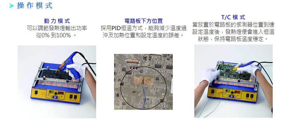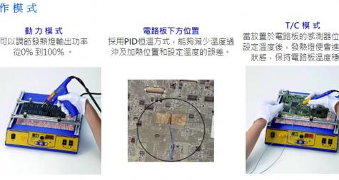 兩組共六個碳纖發熱燈對電路板的加熱十分快速。差不多在電源起動後便能夠同時間把電路板全面加熱,大大提高返修和後期加工的效率,特別在處理多層電路板時需要較大的熱量傳輸。而且FR-870B不會釋放污染物,所以在提高工作效率之餘,也能夠保持潔淨的工作環境。