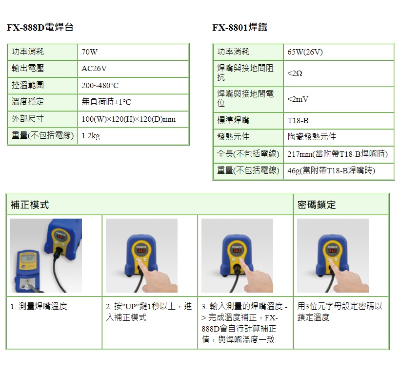 傳統焊台需要仔細調節(CAL)旋鈕來校正設定溫度和焊嘴實際溫度的誤差,FX-888D只需輸入焊嘴的實際溫度就可以完成補正溫度。