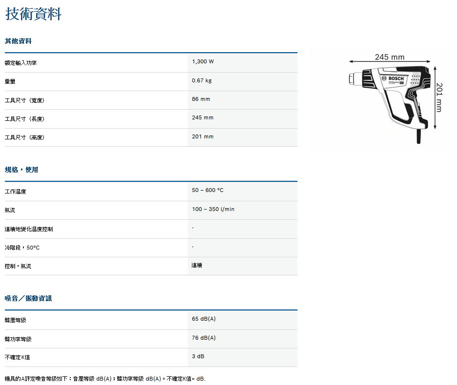 嚴苛應用、全方位掌控 全方位溫度控制 : 無極變速氣流、可微調溫度( 每次 10 °C ) 及可根據溫度需求和空氣流量,設置 4 種設定 1300W 動力輕鬆平穩達到 600 °C (因台灣販售機台為低電壓機種,因此實際入力及溫度會與上方原始規格有些許差異) 當馬達過熱時,熱保護關閉機制自動開啓