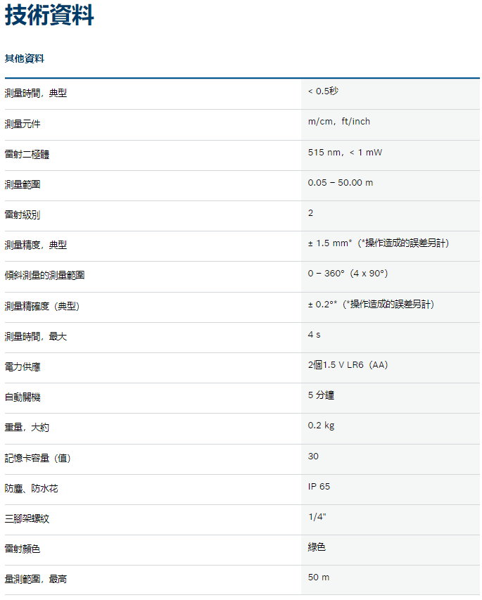 出色的耐用性:二合一雷射測量和綠色雷射,適用於粗糙不平的現場 整合式的360°傾斜感測器可輕鬆進行角度 / 傾斜度測量,為雷射測量增加了許多便利的功能 直覺的使用者介面以及其他支援功能(收藏夾按鈕、彩色顯示幕、說明功能)使操作更加便捷 IP 65防護等級和減震橡膠外殼,非常適合要求嚴苛的現場