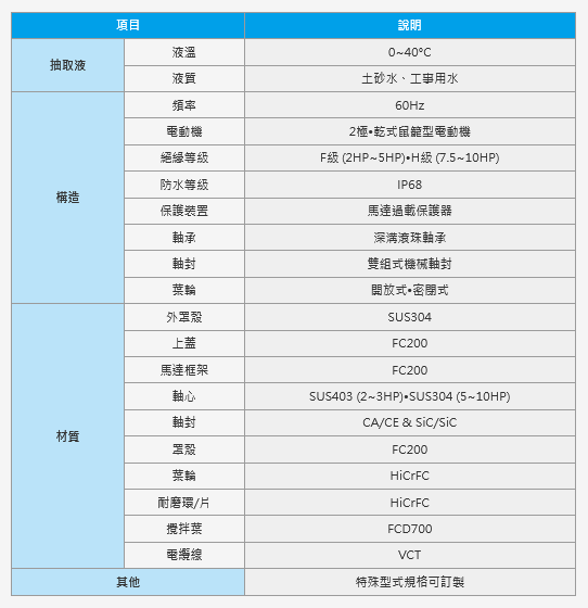 ● 多樣性的葉輪設計,採用高鉻鋼(HiCrFC)材質,硬度高達HRC 55~60度,為工事泵浦中最高韌性與高硬度之葉輪;且高硬度材質耐磨耗,可長期抗砂石磨耗。