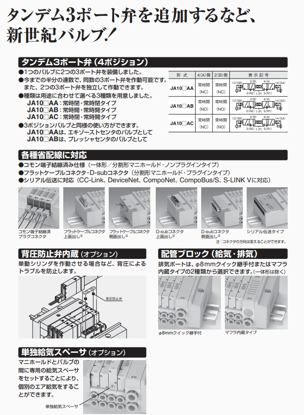 ● 缸徑可達40mm,閥寬10.5mm,外形纖薄緊湊。加速機械設備的空間節省。作為串聯式3通閥等閥門,具備高附加值。