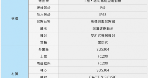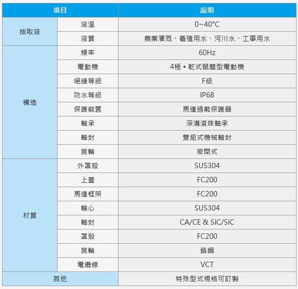 ● 配備齊全 : 環氧樹脂( Epoxy)防水電纜基座、馬達過載保護器、雙組式SiC矽碳鋼(Silicon Carbide)機械軸封,通過高標準品質及嚴謹品檢程序。