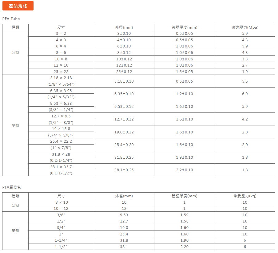 ■ 特性: 1. 有良好的耐化學性,分子間引力小 2. 有不黏著性,摩擦、黏性較低 3. 耐候性佳,不易出現損耗變形 4. 良好絕緣材料 5. 使用壽命長,於固體樹脂中摩擦係數最好 ■ 材質:過氟烷基化物 ■ 溫度:最高達260℃(加工後達200℃) ■ 範圍:藥液循環配管、加熱器外套管、絕緣套管