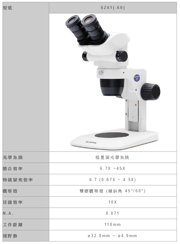 格里諾(Greenough)光學系統提供了SZ51實體顯微鏡極佳的立體影像,並且採用V型光路可以設計出修長的機身,使得它們容易架設在各式各樣的機台上。