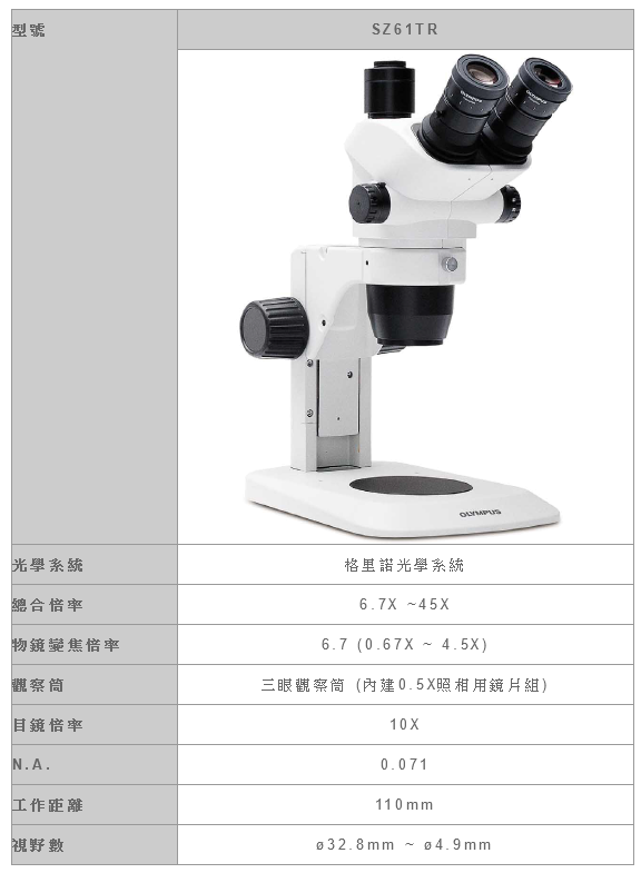 格里諾(Greenough)光學系統提供了SZ51實體顯微鏡極佳的立體影像,並且採用V型光路可以設計出修長的機身,使得它們容易架設在各式各樣的機台上。