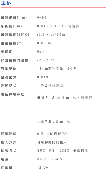 50mm的量測範圍,0.01μm的高精度解析度,最低膨脹係數的主軸,陶瓷材質的量測台。