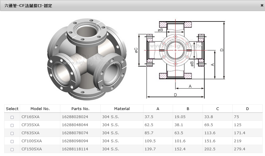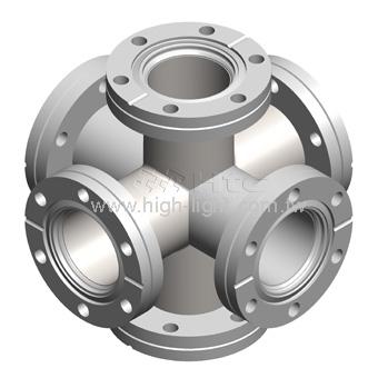 規格為Conflat 法蘭的正立方體六通應用於超高真空環境. 法蘭尺寸CF-100及以下的規格是以整塊材料加工而成, 法蘭尺寸CF-150及以上的規格是以鋼板焊接而成. 產品標準材質為SS304, 其他材質可依客戶需求製造