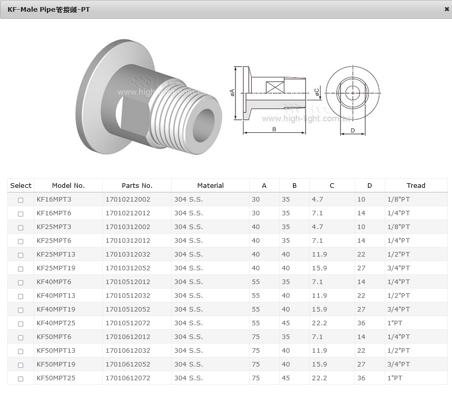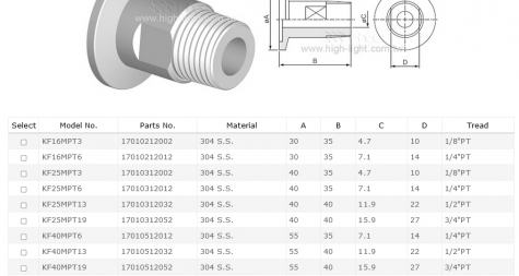 KF-Pipe管接頭,有公接頭與母接頭兩種形式,而每種形式有分PT牙與NPT牙兩種