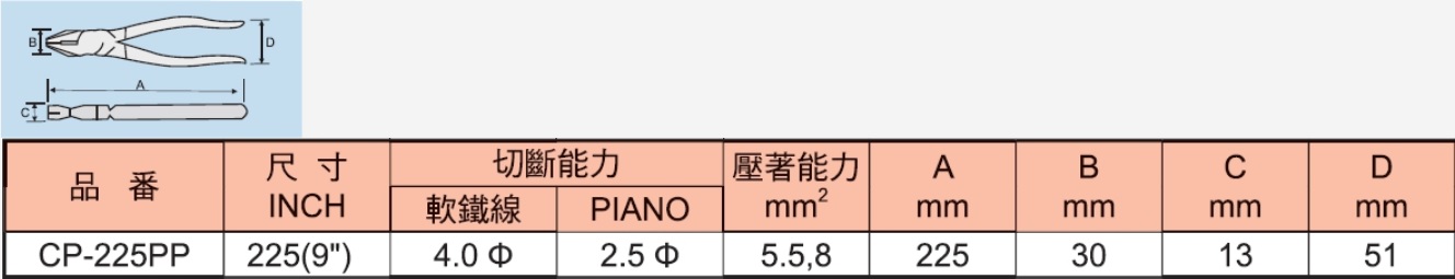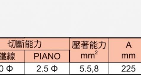 ♦材質:CR-MO (附壓著)。 ♦CP-225PP採用CR-MO(鉻鉬鋼)材質鍛造熱處理加工,偏心式設計,可輕易剪斷Piano線,內部網狀爪,爪、咬物更牢靠。 ♦CP-225PP附壓著5.5、8mm規格,讓產品更多元化,適合一般建築、水電、鐵工等用途。