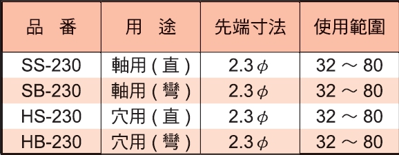 ♦尺寸從最小125mm至最大300mm,每種尺寸都有軸用、穴用、直式與彎式。