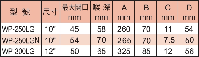 ♦材質:鉻釩鋼 CR-V。 ♦【特殊長嘴幫浦鯉魚鉗】 此型幫浦型,重點在於超長嘴的設計,其口徑、夾具力、旋力、扭力皆比同尺寸的幫浦鉗大,使用更輕鬆,末端呈起子型,增加功能。 PAT專利品(仿冒必究)WP-250-LG長嘴幫浦鉗為5段鋸齒狀調整;WP-300LG長嘴幫浦為6段溝槽式調整。