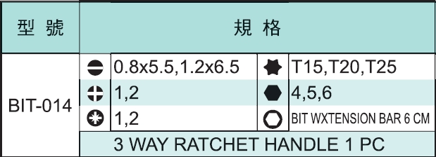 ♦三向棘輪起子BIT組集合眾多規格於一身,一次解決攜帶多支起子及零配件的缺點。 ♦棘輪省力裝置,並且可左、右方向切換,使用起來輕鬆方便。 ♦加附一支6cm延長接桿,可觸達較深的溝縫當中使用。 ♦可另外選購轉換頭,可同時使用精密起子或套筒,真正達到一支多用途功能。