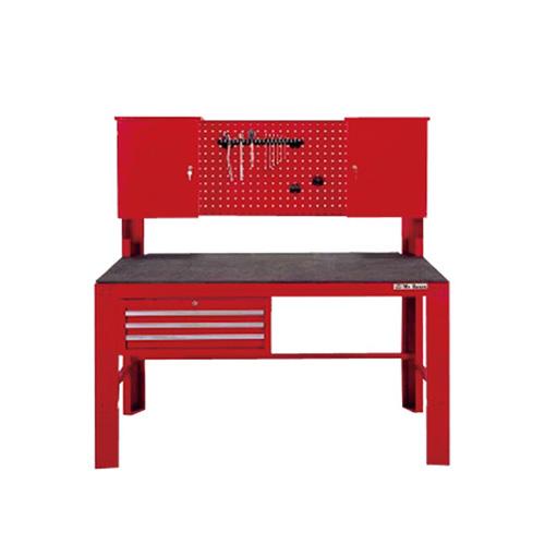 ♦豪華型工作台,桌面下附3只抽屜櫃,桌上櫃有2只附門鎖櫃與平面洞洞板,增加工具收納空間。