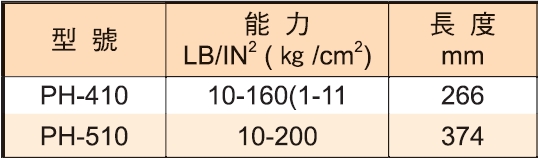 ♦PH-410適用於小型車輛。 ♦PH-510適用於大型車輛。 ♦採用鋁製本體和鍍鎳表面。 ♦頭部材質為鋅合金。 ♦中央附金屬掛環。 ♦2面鋅材質刻度尺,不易磨損,並可同時看兩種刻度(LB/IN 和kg/cm2)。