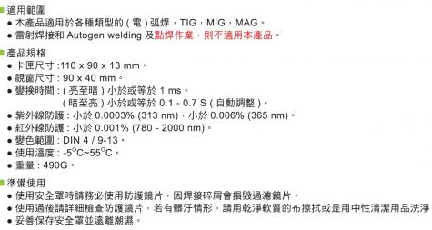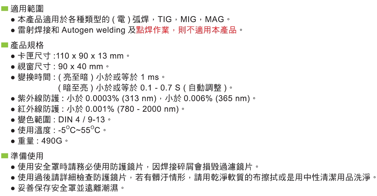 ♦保護使用者的眼睛免於紫外線和紅外線的傷害。 ♦鏡片明暗度可調整,電子操控系統則可以分辨出電焊光和太陽光的差異性。 ♦太陽能板則可以藉著自然光源或是焊接所發出的光線提供所需電力。 ♦若安全照閒置15分鐘不使用,電源則會自動關閉。