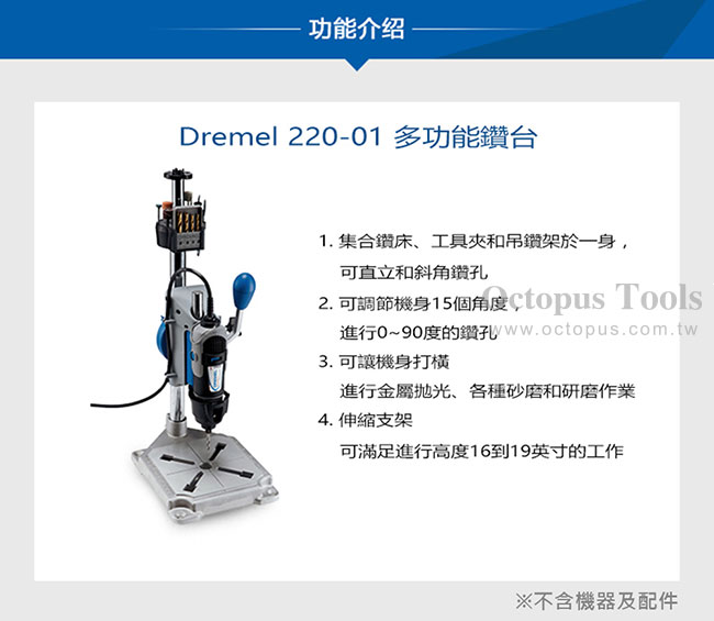 ◆ 集合鑽床、工具夾和吊鑽架於一身,可直立和斜角鑽孔。