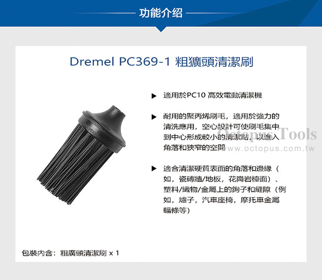 ◆ 耐用的聚丙烯刷毛,適用於強力的刷洗。 ◆ 螺紋柄可將刷頭牢牢固定。 ◆ 空心設計可使刷毛集中到中心並形成微小的清潔點,以進入角落和狹窄的空間。 ◆ 適合清潔硬質表面的角落和邊緣,如磁磚牆/地板、花崗岩檯面;塑料/織物/金屬上的鉤子和縫隙(例如:爐子、汽車座椅、摩托車金屬條...等。) ◆ 適用於PC10 高效電動清潔機。